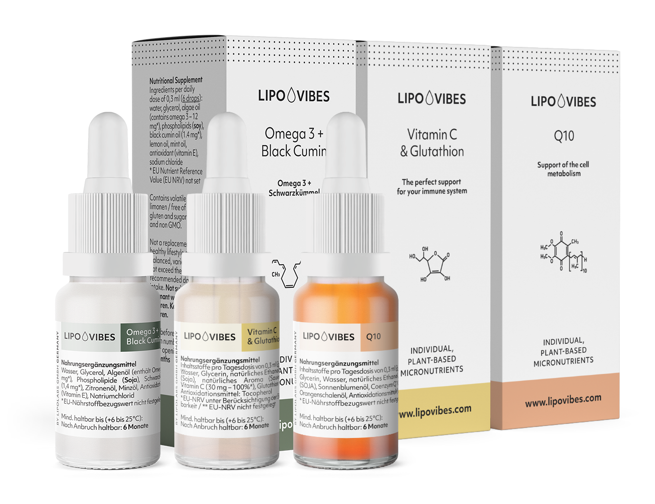 Nutritional supplements play an important role in supporting and promoting the health of skin, hair and nails. The right combination of nutrients can improve the external appearance and at the same time strengthen the inner well-being. In this context, the LipoVibes™ Omega 3 with Black Cumin Oil, Vitamin C + Glutathione and Q10 programme offers a promising way to provide targeted support for skin, hair and nail health. The specific benefits of these products are explained in detail in the following paragraphs.