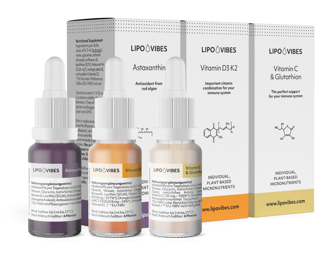 The combination of LipoVibes™ Astaxanthin, Vitamin D3 K2 and Vitamin C + Glutathione works synergistically on the immune system and cellular health by supporting and improving various mechanisms of the body. Here are the specific synergistic effects of these three supplements: